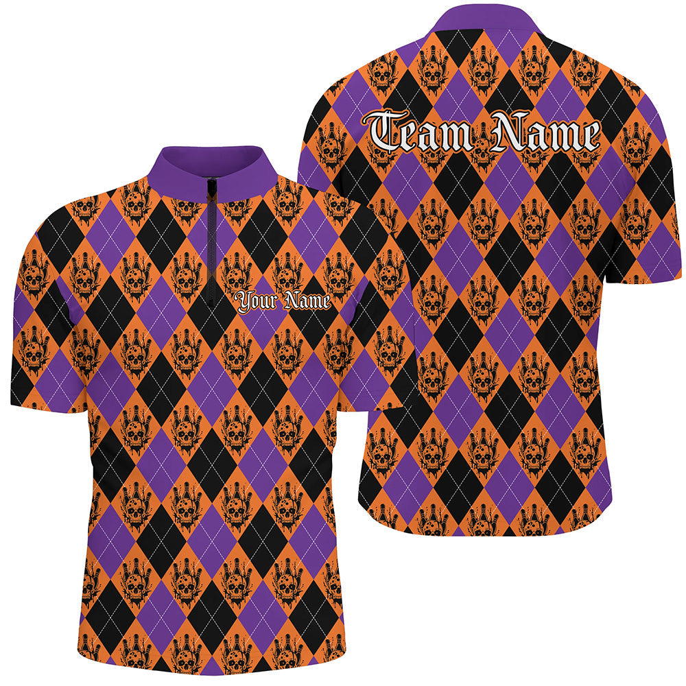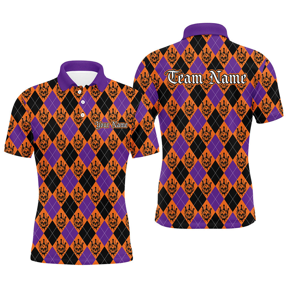 Orange And Purple Argyle Pattern Custom Skull Halloween Bowling Shirts For Men Bowlers Outfits IPHW7302