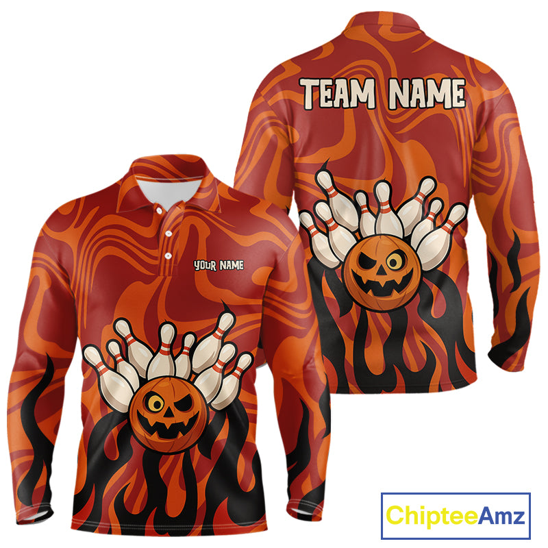 Orange camo flame Bowling polo, quarter zip shirts for men custom Halloween Bowling team jerseys NQS10395
