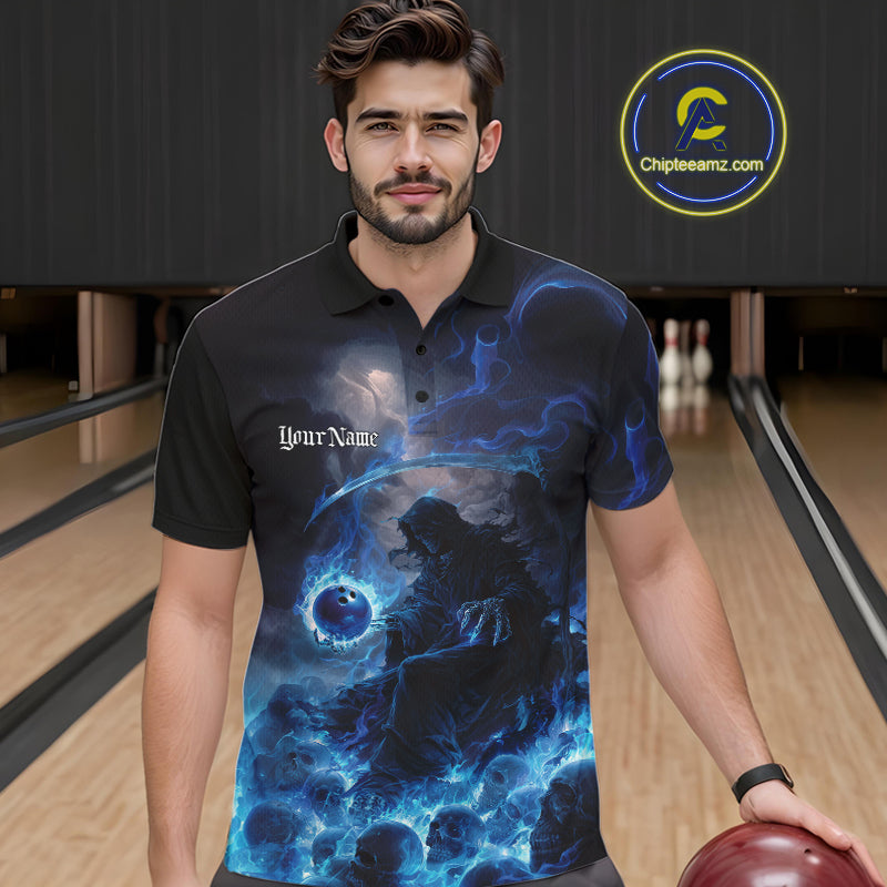 Custom Electric Blue Fire Grim Reaper Bowling Polo Shirts For Men, Halloween Bowling Shirt IPHW9464