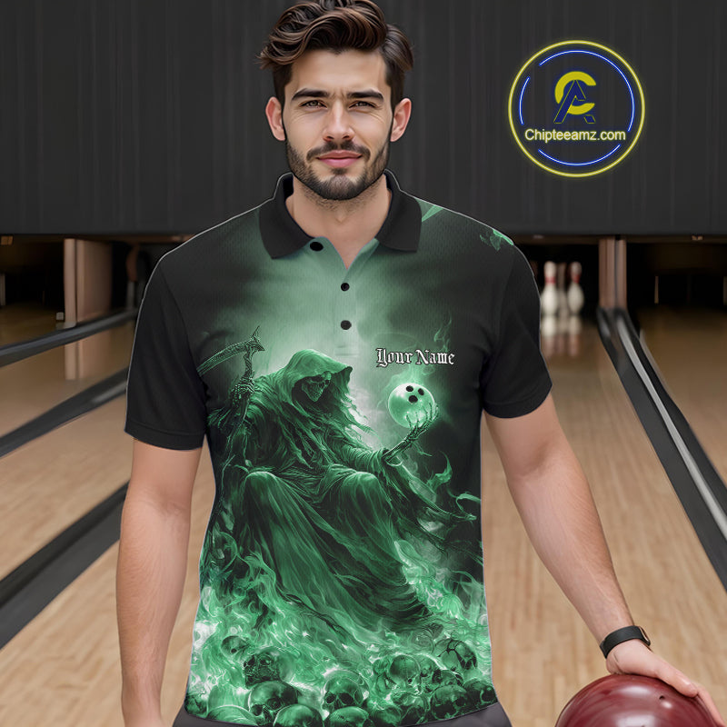 Custom Green Flame Grim Reaper Bowling Men Polo Shirts, Halloween Bowling Team Outfit IPHW9469