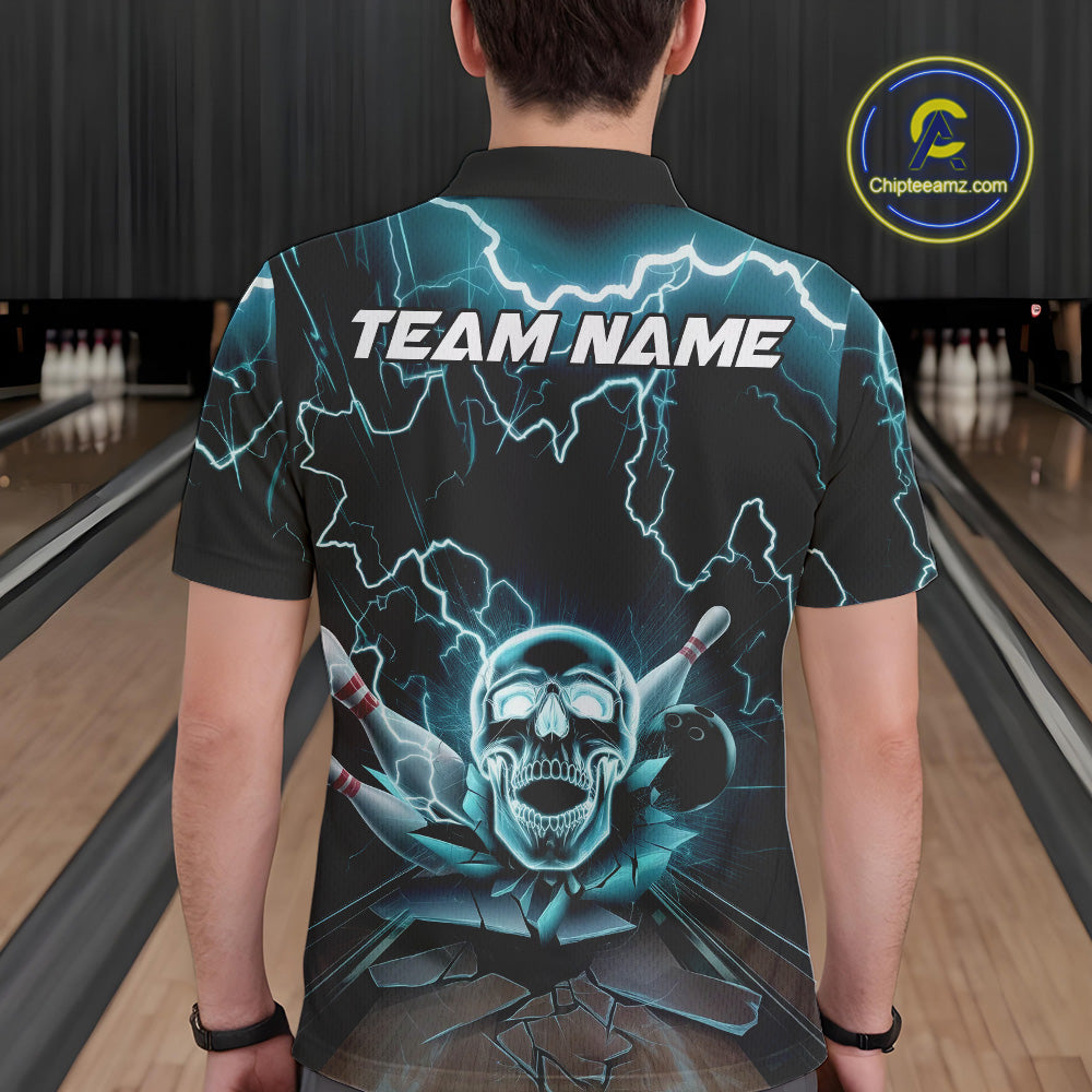Custom Blue Thunder Lightning Skull Bowling Polo Team Shirts For Men, Halloween Outfit IPHW9497