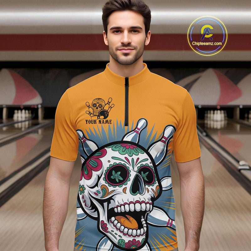 Custom Sugar Skull Bowling Quarter-Zip Shirts For Men, Halloween Bowling Team Outfit IPHW9253