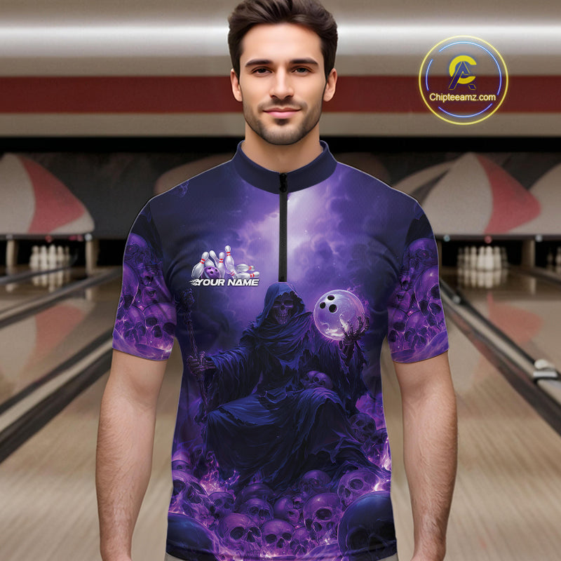 Custom Blue And Purple Flame Bowling Skull Quarter-Zip Shirts For Men, Halloween Bowling Outfits IPHW9467