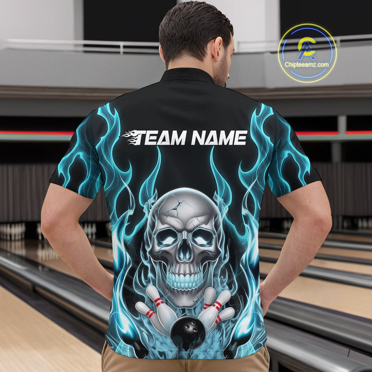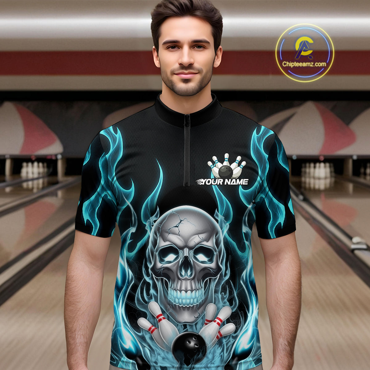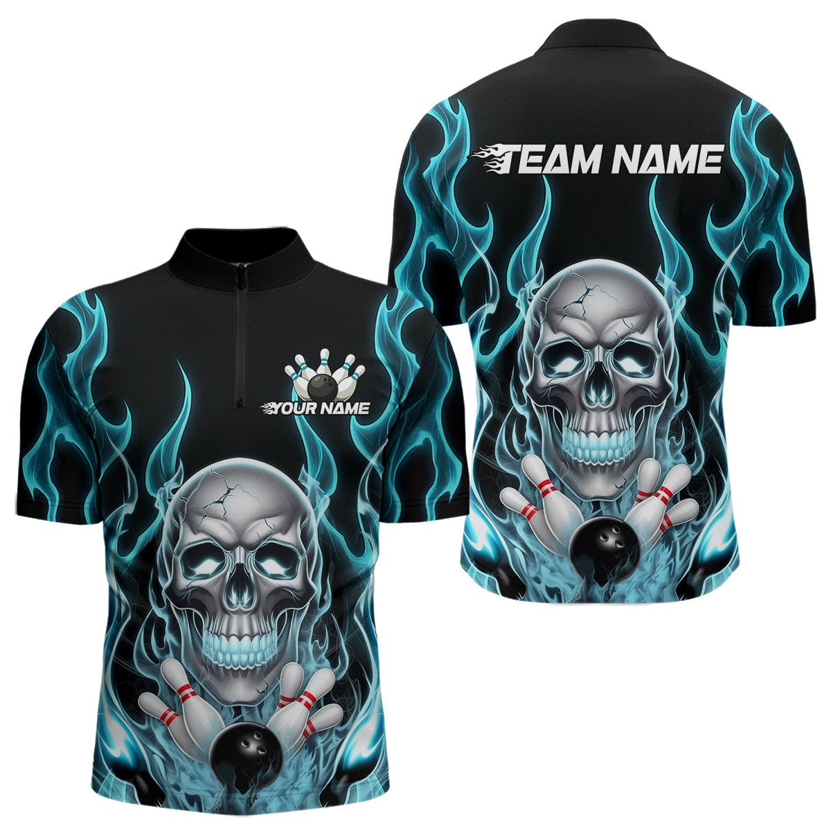 Custom Blue Fire Flame Skull Bowling Quarter-Zip Shirts For Men, Halloween Bowling Team Outfit IPHW9491