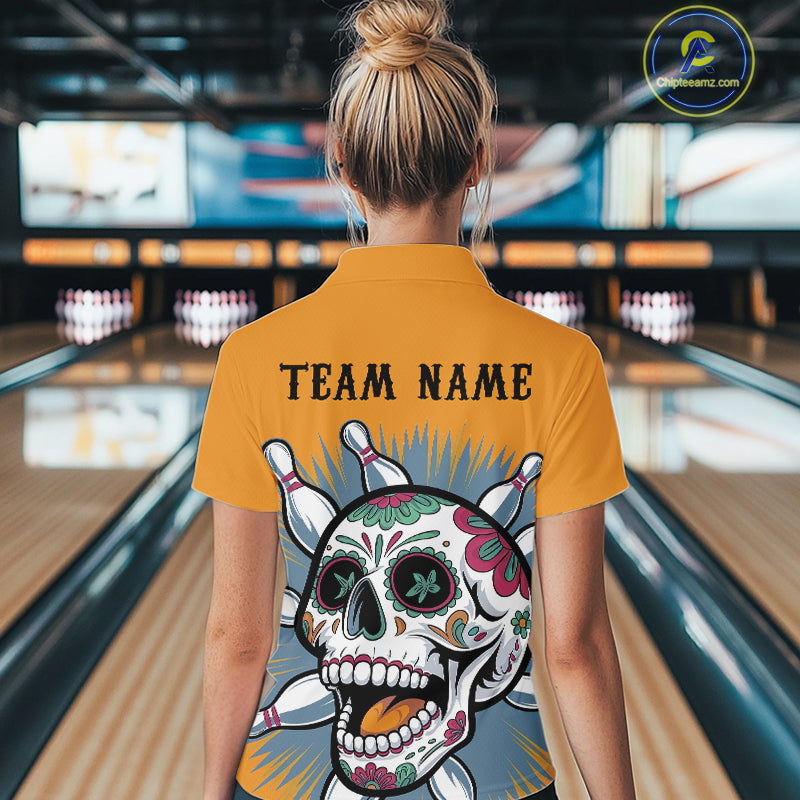 Custom Sugar Skull Bowling Women Quarter-Zip Shirt, Halloween Bowling Team Outfit IPHW9253