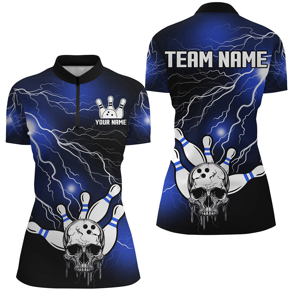 Skull Bowling 1/4 Zip Shirt For Men & Women Light Thunder Blue Bowling Team Jersey Halloween BDT541