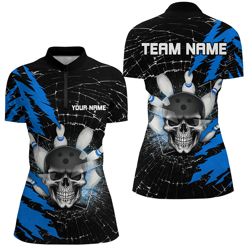 Skull Bowling Quarter-Zip Shirt For Men & Women Custom Halloween Bowling Team Jersey Blue BDT538