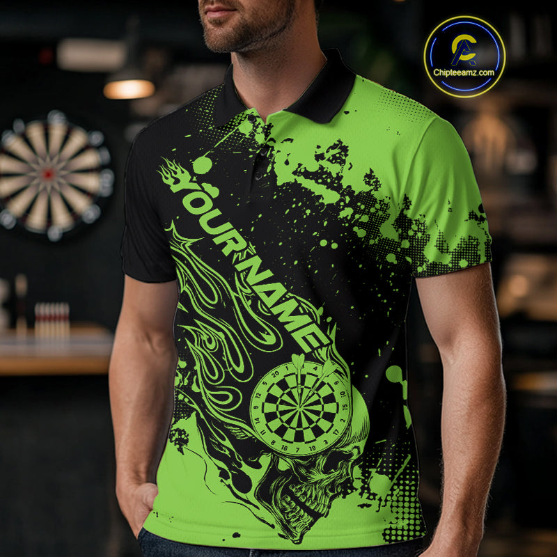 Custom Black And Green Splatter Flame Dart Skull Men Polo Shirt, Grunge Halloween Jerseys IPHW10052