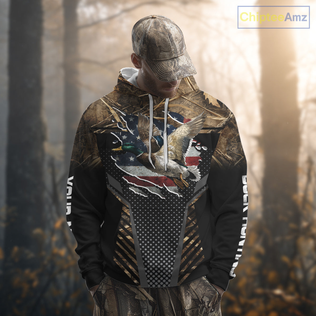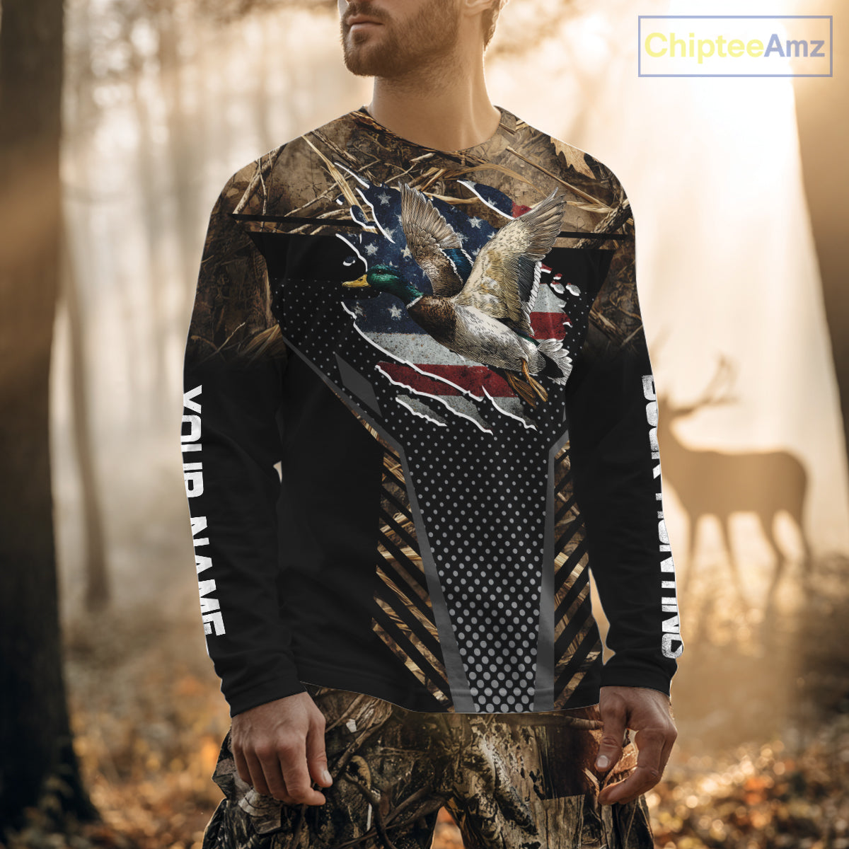 Designed for duck hunters and outdoor enthusiasts, this shirt combines style, comfort, breathability, and functionality in one. Featuring a unique waterfowl-inspired design, it can be personalized with your name, along with details like the American flag, realistic grass camo patterns, and even your loyal hunting dog – making it the perfect gift idea for hunters during duck hunting season.