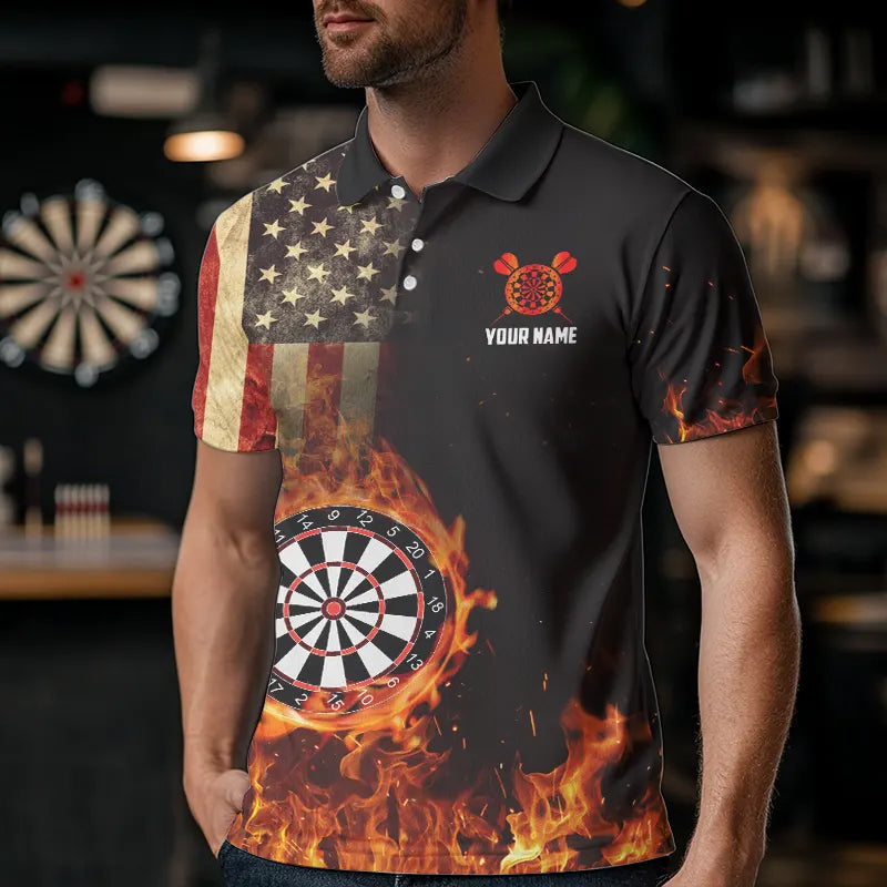Personalized Retro US Flag Flame Dartboard Darts Shirts For Men, Patriotic American Dart Jerseys TDM3676