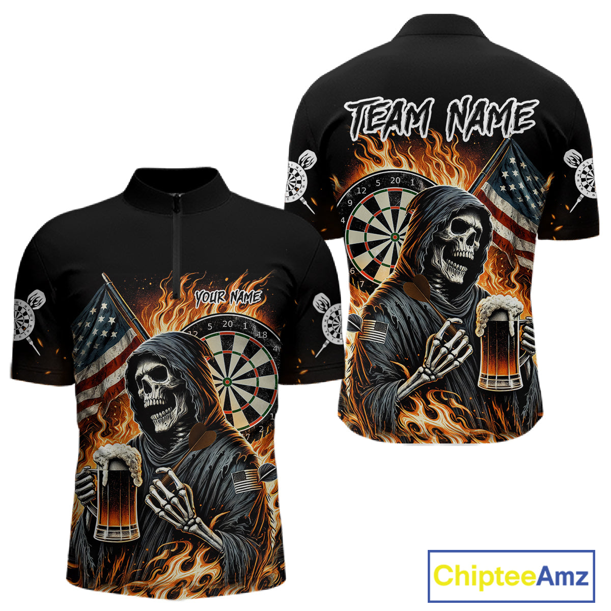 Flaming Grim Reaper Beer Darts Shirt Custom US Flag Darts Polo & Quarter Zip Jerseys For Women TDM4526