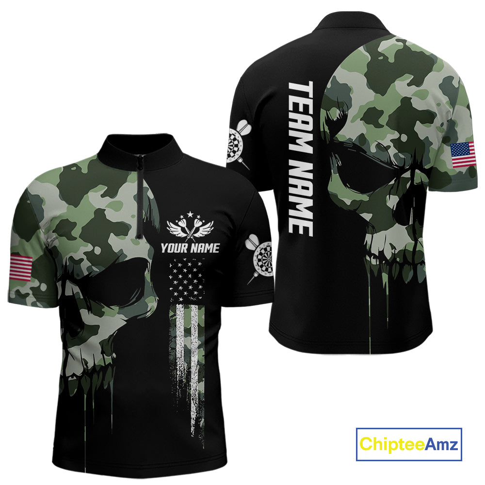Green Camouflage Skull Darts Shirt For Men Custom Patriotic US Flag Darts Jersey Polo & 1/4 Zip TDM5300