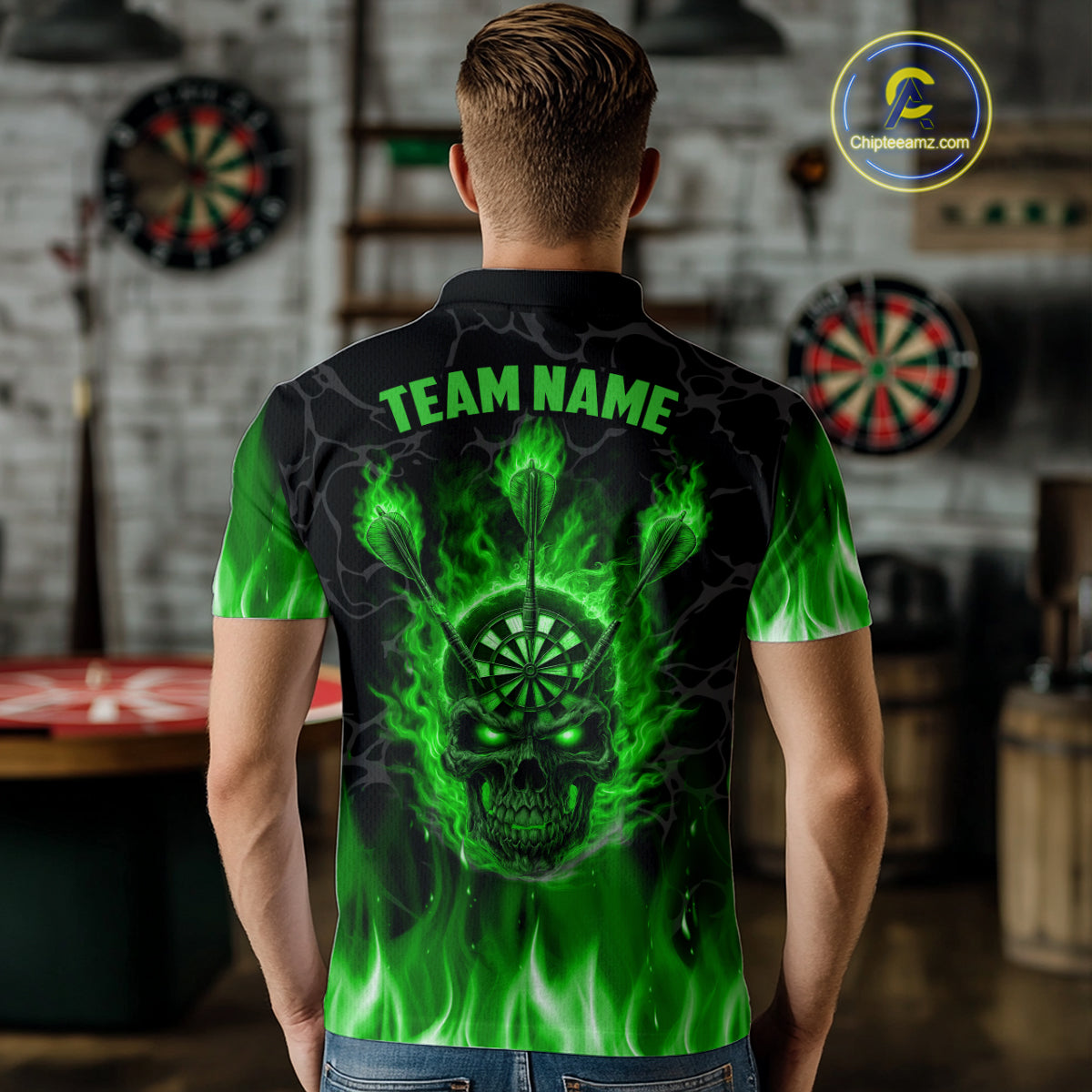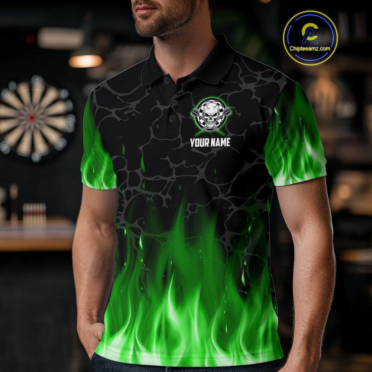 Fire Flame Skull Darts Polo & Quarter Zip Custom Darts Shirts For Men, Darts Team Jersey|Green TDM5321