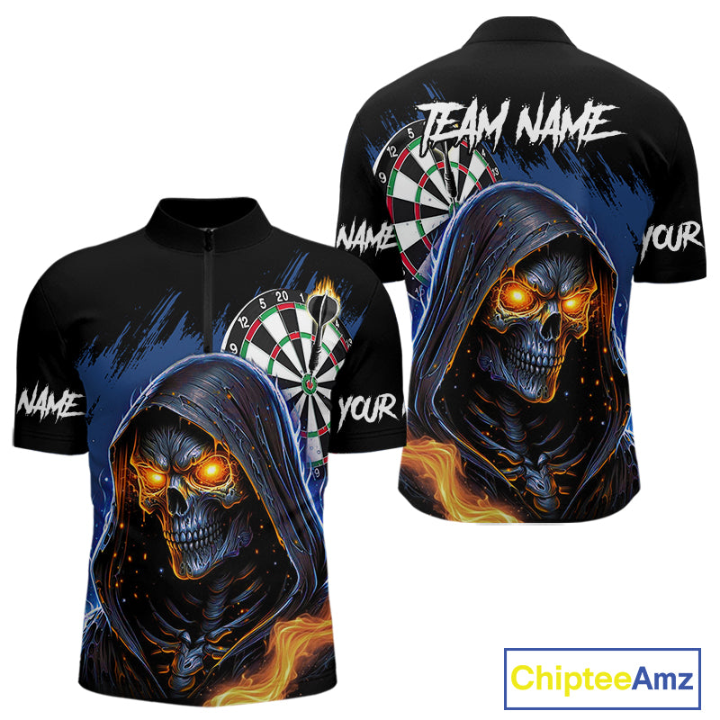Personalized Blue Death Skeleton Fire Dart Shirts For Men Custom Skull Dart Jersey Polo & 1/4 Zip TDM4892
