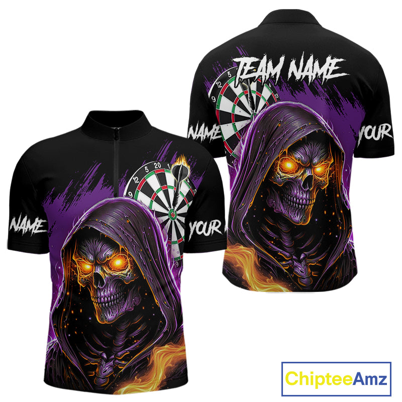 Personalized Purple Death Skeleton Fire Dart Shirt For Men Custom Skull Dart Jersey Polo & 1/4 Zip TDM4893
