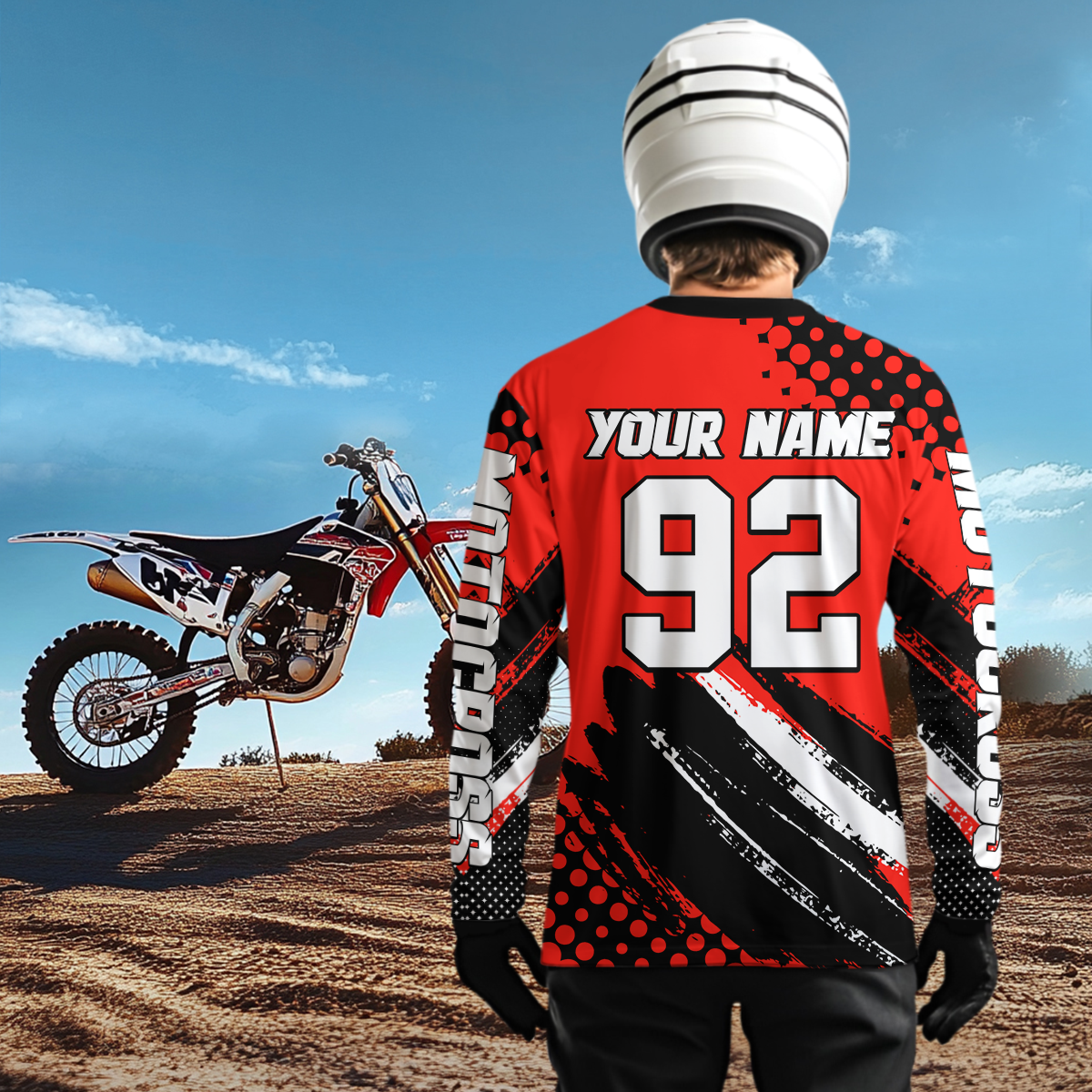 - PERSONALIZED MOTOCROSS JERSEY: This super cool long-sleeved shirt is exactly what all bikers are looking for. Add your name/number to make it a unique one that bears your own imprints.