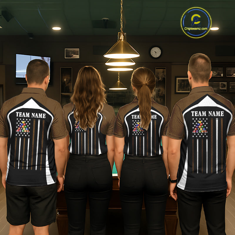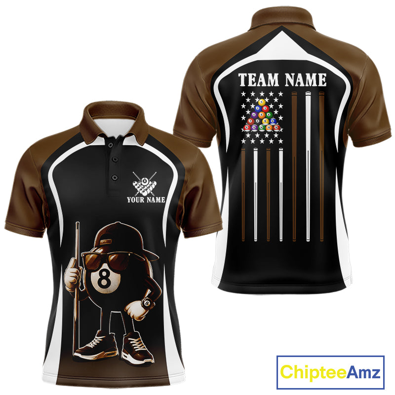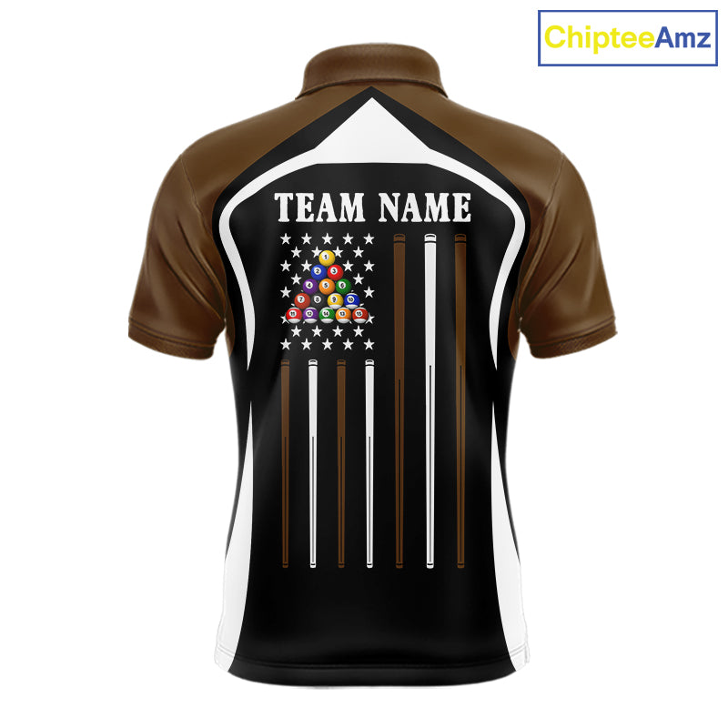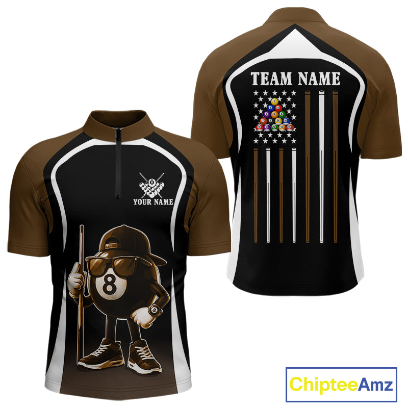 Brown Funny 8 Ball Pool US Flag Billiard Shirt For Men Custom Billiard Team Jersey Polo & 1/4 Zip TDM6366