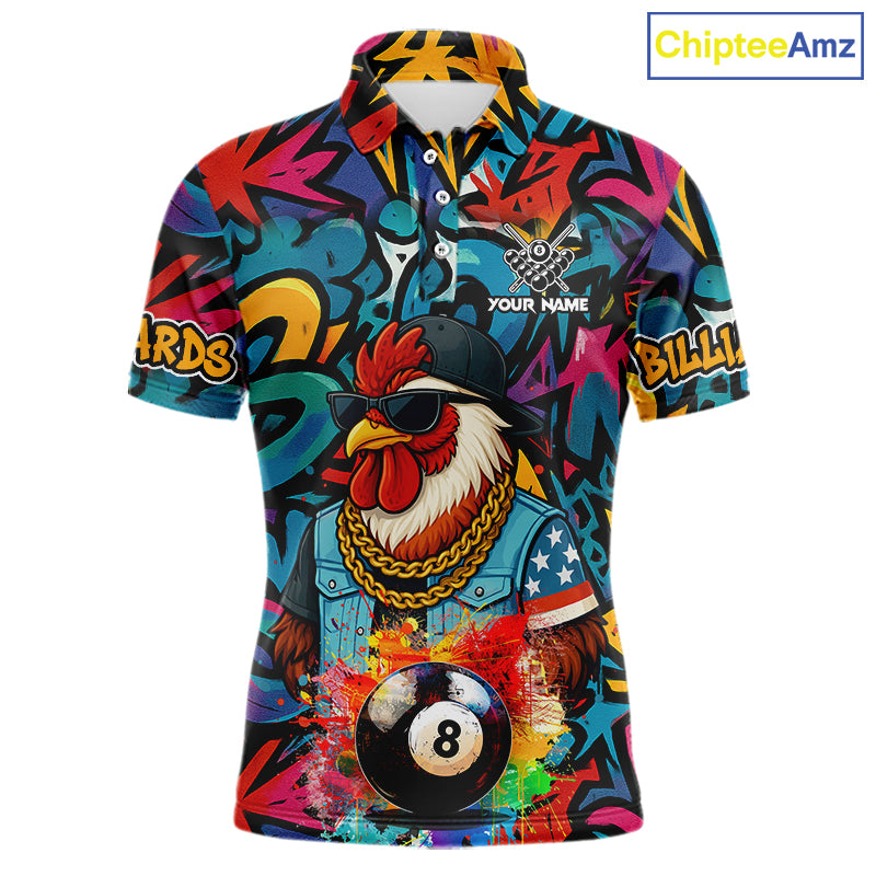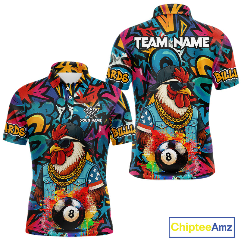 Funny Rooster Colorful Graffiti 8 Ball Billiard Shirt For Men Custom Pool Jersey Polo & 1/4 Zip TDM6368