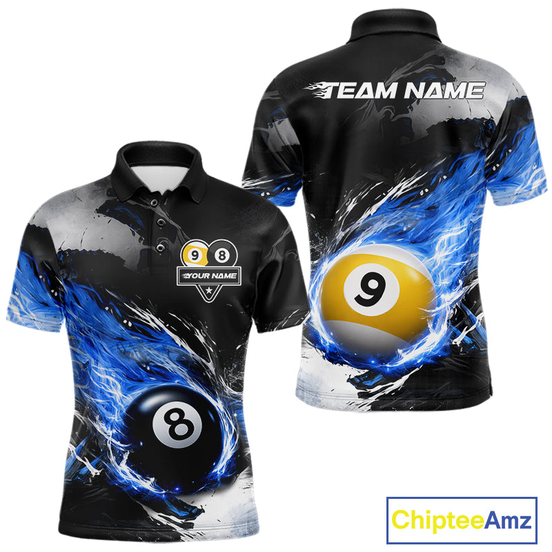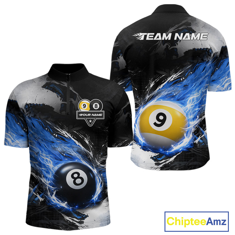 Custom 8 Ball & 9 Ball Pool Blue Flame Billiard Shirt For Men, Billiard Team Jersey Polo & 1/4 Zip TDM6372