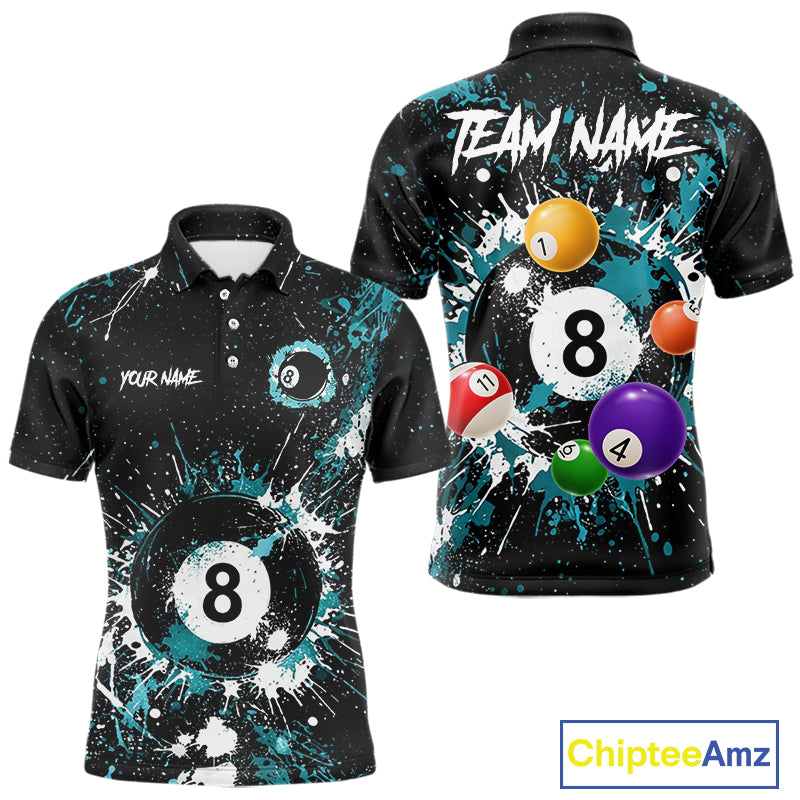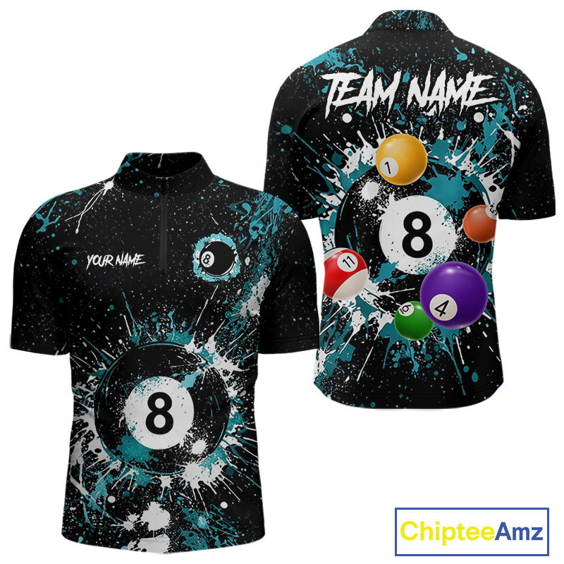 Black And Teal 8 Ball Pool Men Billiard Shirt Personalized Splatter Paint Billiard Jersey For Pooler NYN3088