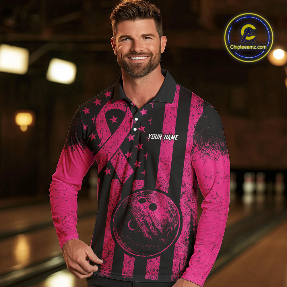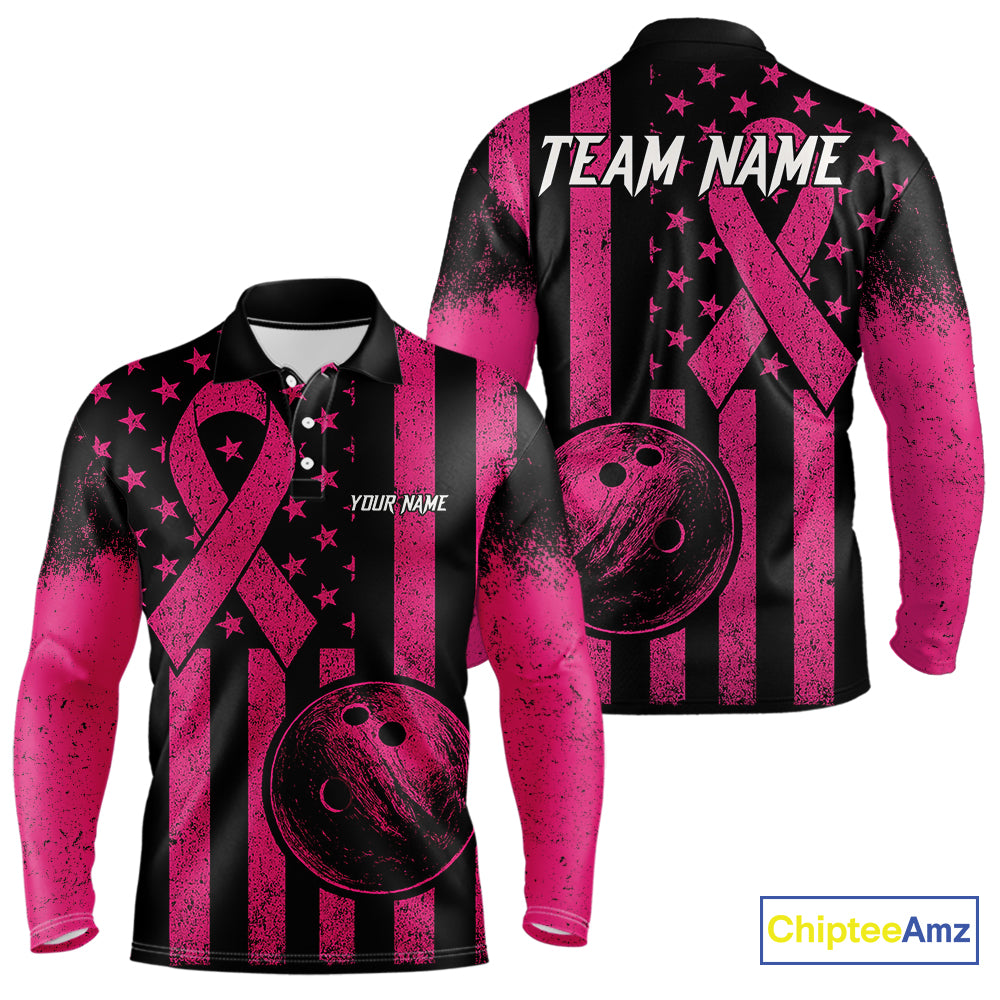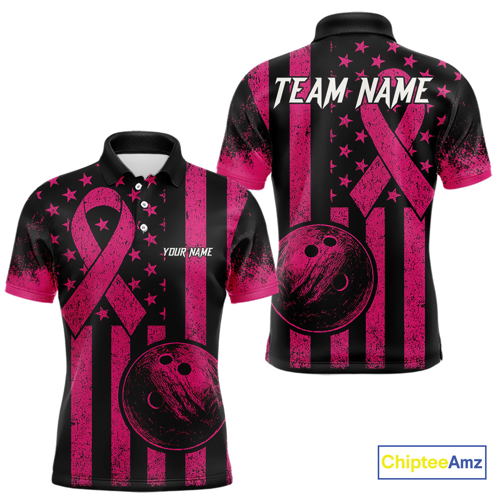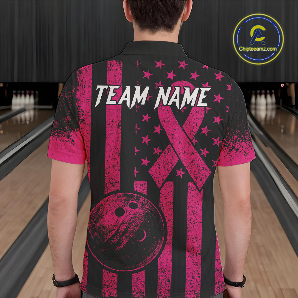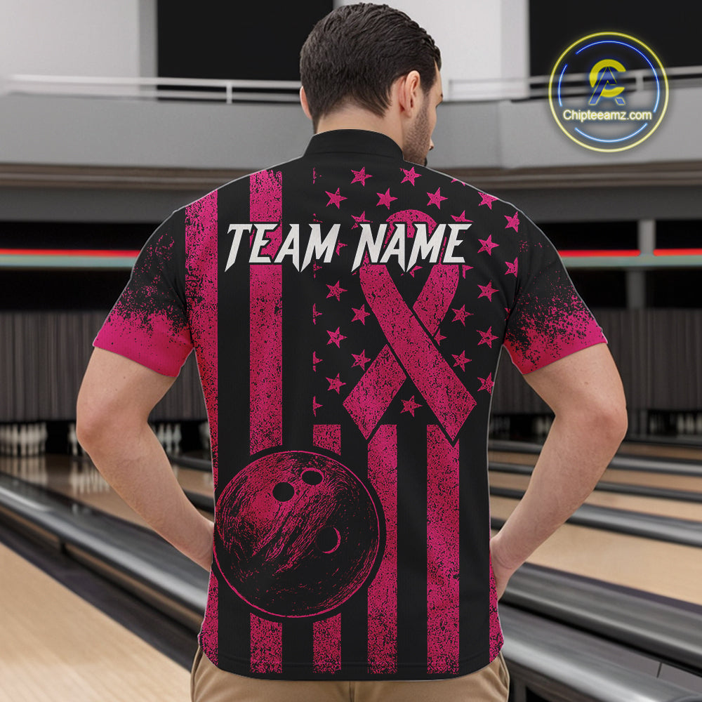 Black and Pink ribbon American Flag Bowling Shirts For Men Custom Breast Cancer team bowling shirts NQS9843