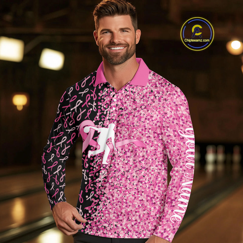 Pink glitter ribbon black Bowling Shirts For Men Custom Breast cancer bowling shirts gift for bowlers NQS10180