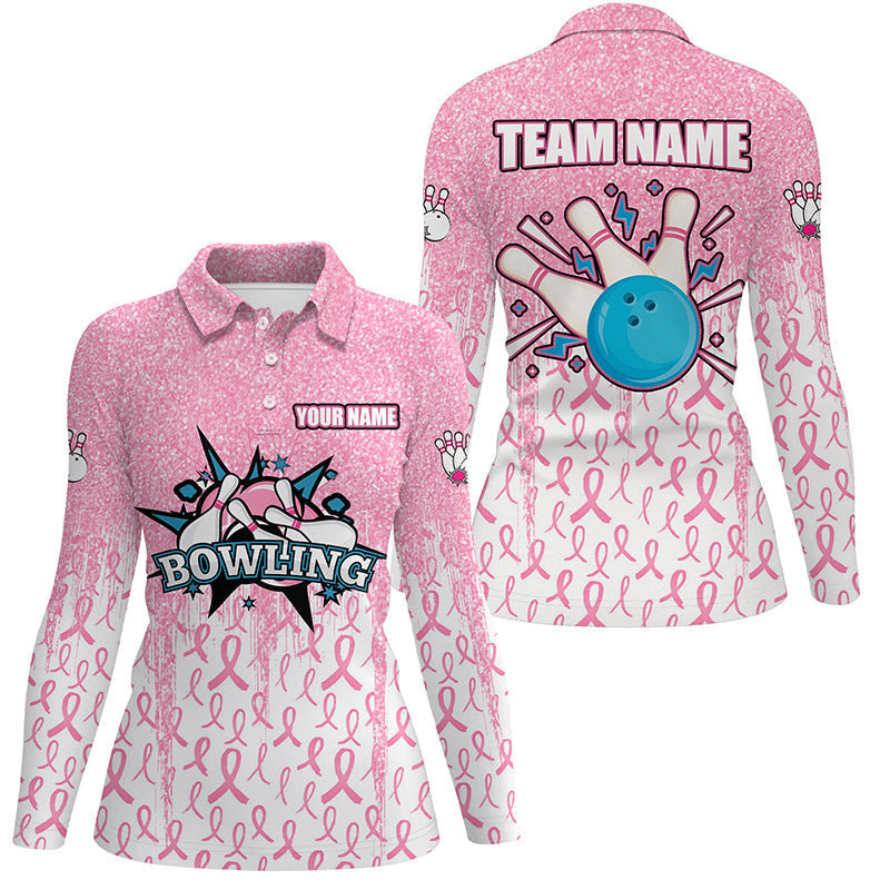 Pink glitter ribbon Women Bowing Polo, 1/4 Zip Shirts Custom Breast Cancer Awareness bowling jerseys NQS8103