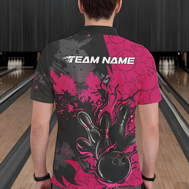 Custom Black And Pink Splatter Camo Flame Bowling Polo Shirts For Men, Bowling Team Uniform IPHW8626