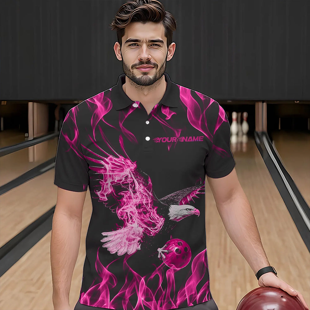 Custom Black And Pink Flame Eagle Bowling Team Men Polo Shirts, Eagle Bowling League Shirt IPHW8791