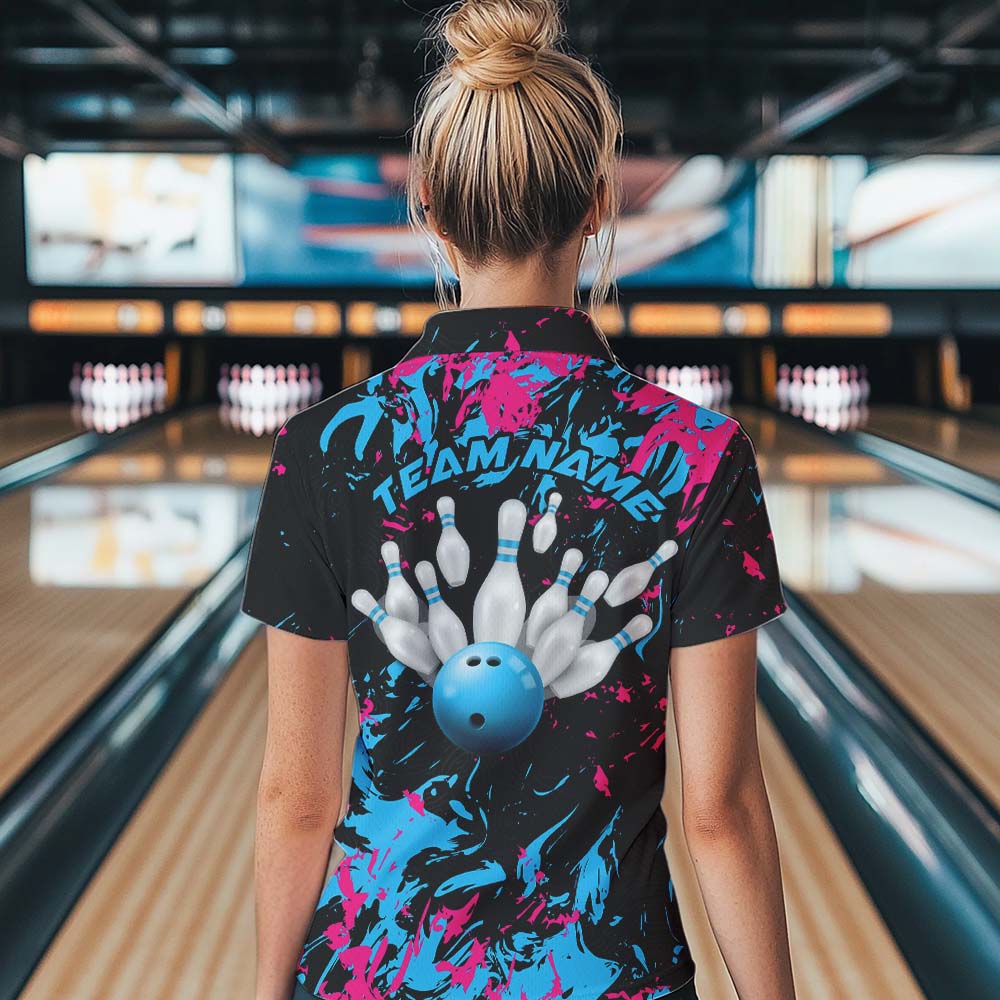Black, Blue And Pink Custom Bowling Team Women Polo Shirts, Bowling Ball And Pin Jerseys IPHW8795