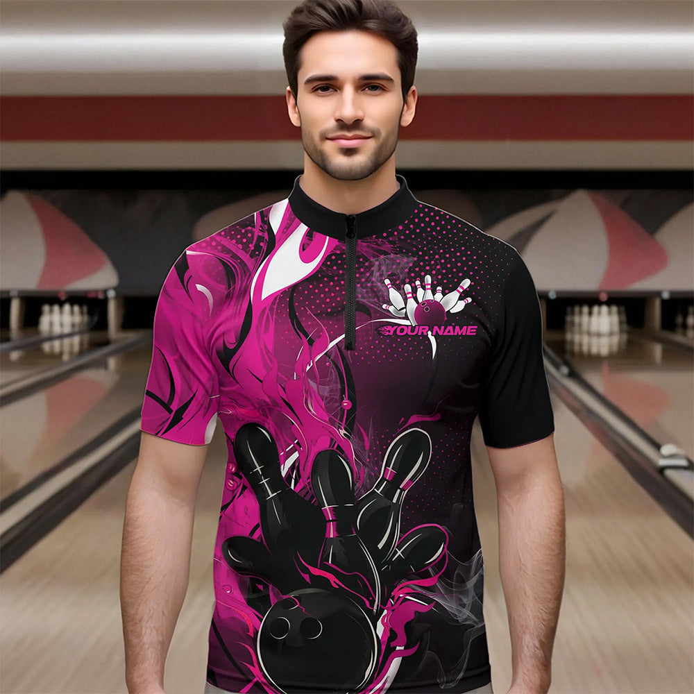 Black And Pink Custom Flame Bowling Quarter-Zip Shirts For Men, Fire Bowling League Team Shirt IPHW8630