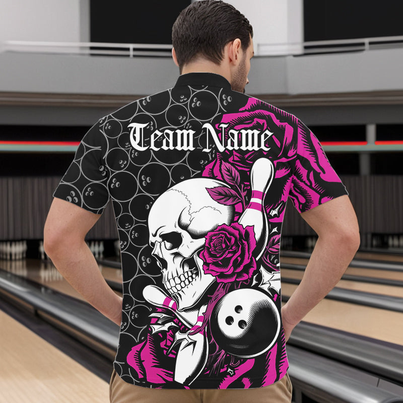 Custom Pink Roses And Skull Bowling Quarter-Zip Shirts For Men, Team Bowling League Shirt IPHW8843