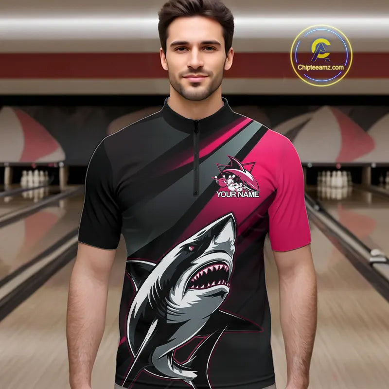 Custom Black And Pink Shark Bowling Jerseys, Bowling Team Uniform Shark Men Quarter-Zip Shirts IPHW9001