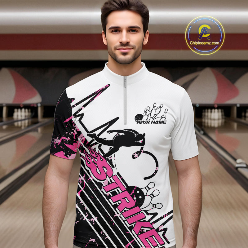Custom Black And Pink Camo Strike Bowling Quarter-Zip Shirt For Men, Bowling Heartbeat Pulse Line IPHW9250