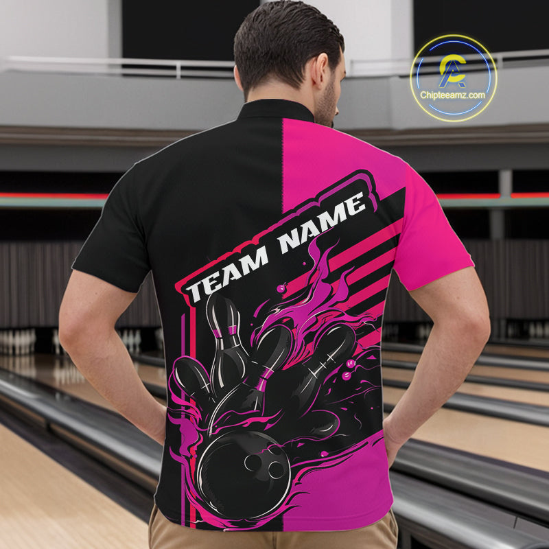 Custom Black And Pink Flame Strike Bowling Quarter-Zip Shirts For Men, Fire Bowling League Shirt IPHW9269