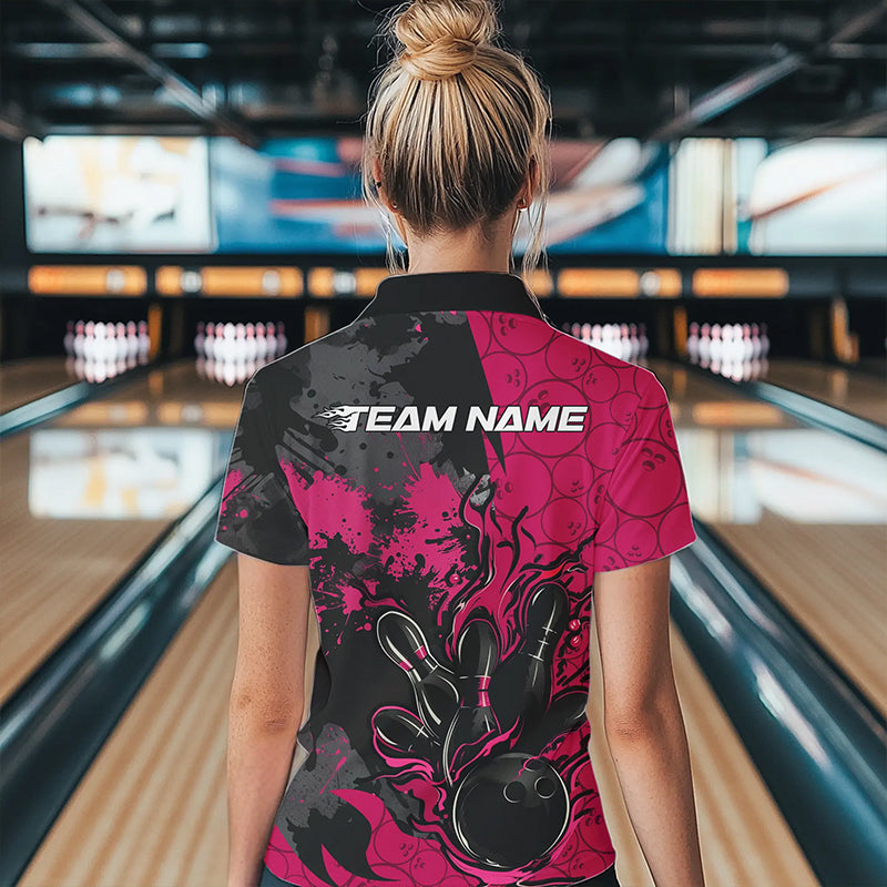 Custom Black And Pink Splatter Camo Flame Bowling Womens Quarter-Zip Shirt, Team Uniform IPHW8626