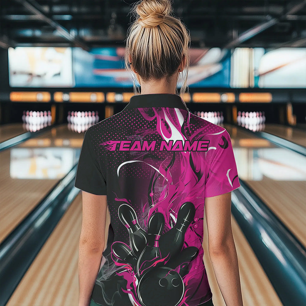 Black And Pink Custom Flame Bowling Womens Quarter-Zip Shirts, Fire Bowling League Shirt IPHW8630