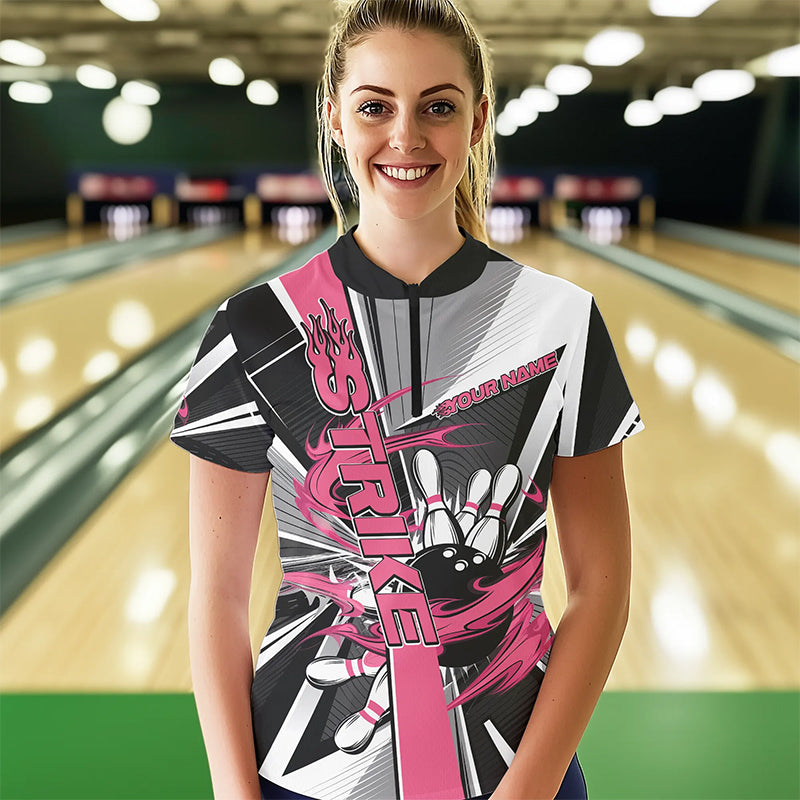 Custom Black And Pink Strike Bowling Women Quarter-Zip Shirts, Bowling Team Shirt With Name IPHW8758