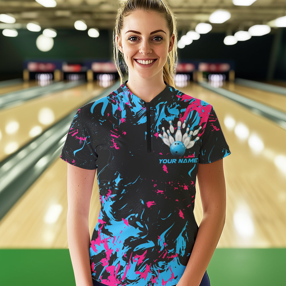 Black, Blue And Pink Custom Bowling Women Quarter-Zip Shirts, Bowling Ball And Pin Jerseys IPHW8795