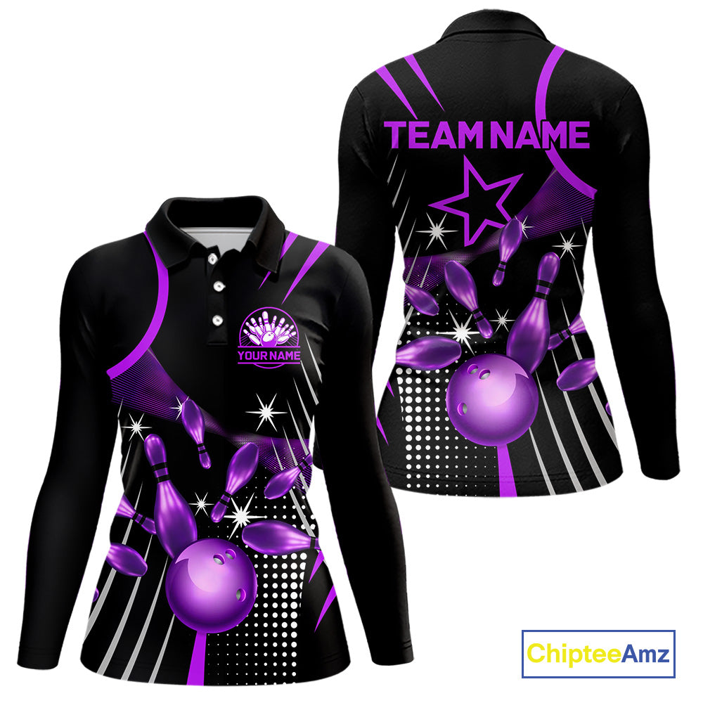 Black and Purple Women Bowling Polo, Quarter Zip Shirts Custom Bowling outfit ladies Team Jerseys NQS9958