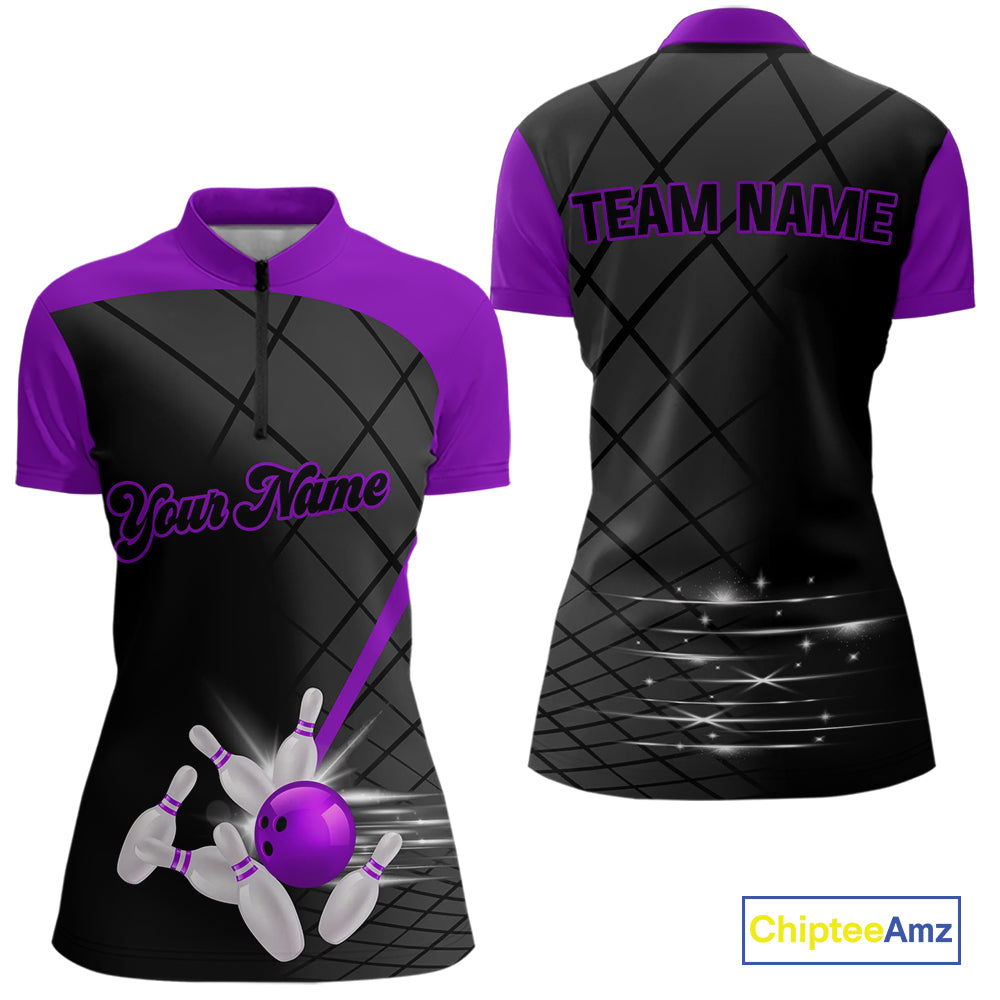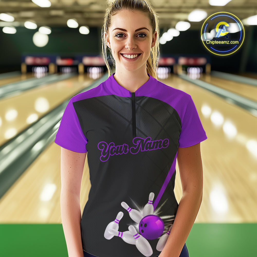 Black & Purple bowling league jersey custom Women Bowling Polo, 1/4 zip Shirt, gift for ladies bowler NQS10097