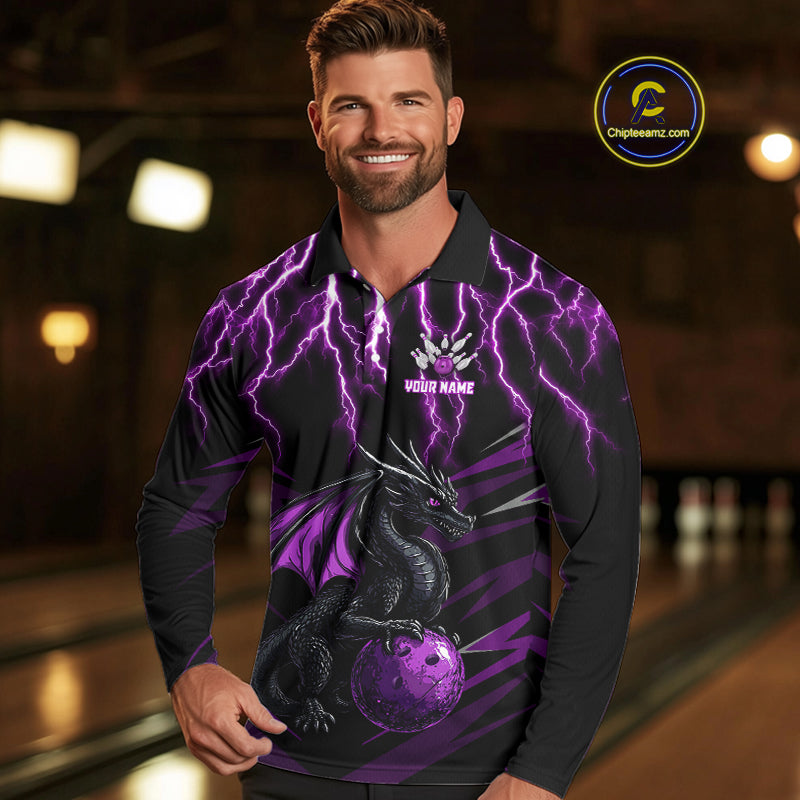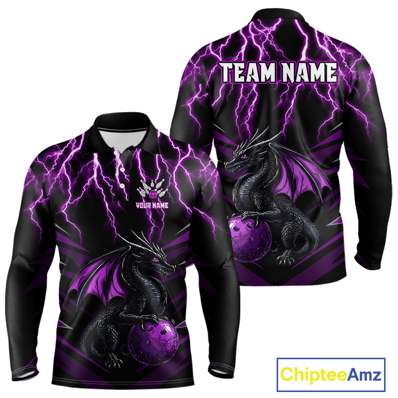 Black & Purple Lightning Thunder Dragon Bowling Shirt For Men Custom Dragon Bowling Team Shirt Uniform NQS9805