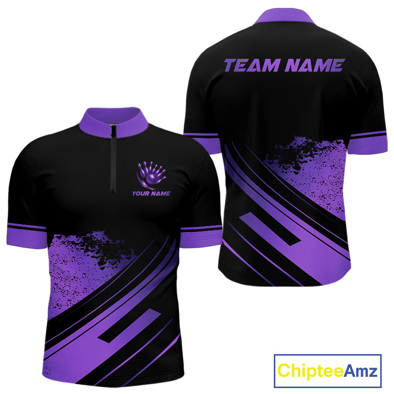 Custom Black And Purple Bowling Team Polo, Quarter-Zip Shirts For Men, Personalized Bowling Jerseys NQS10541