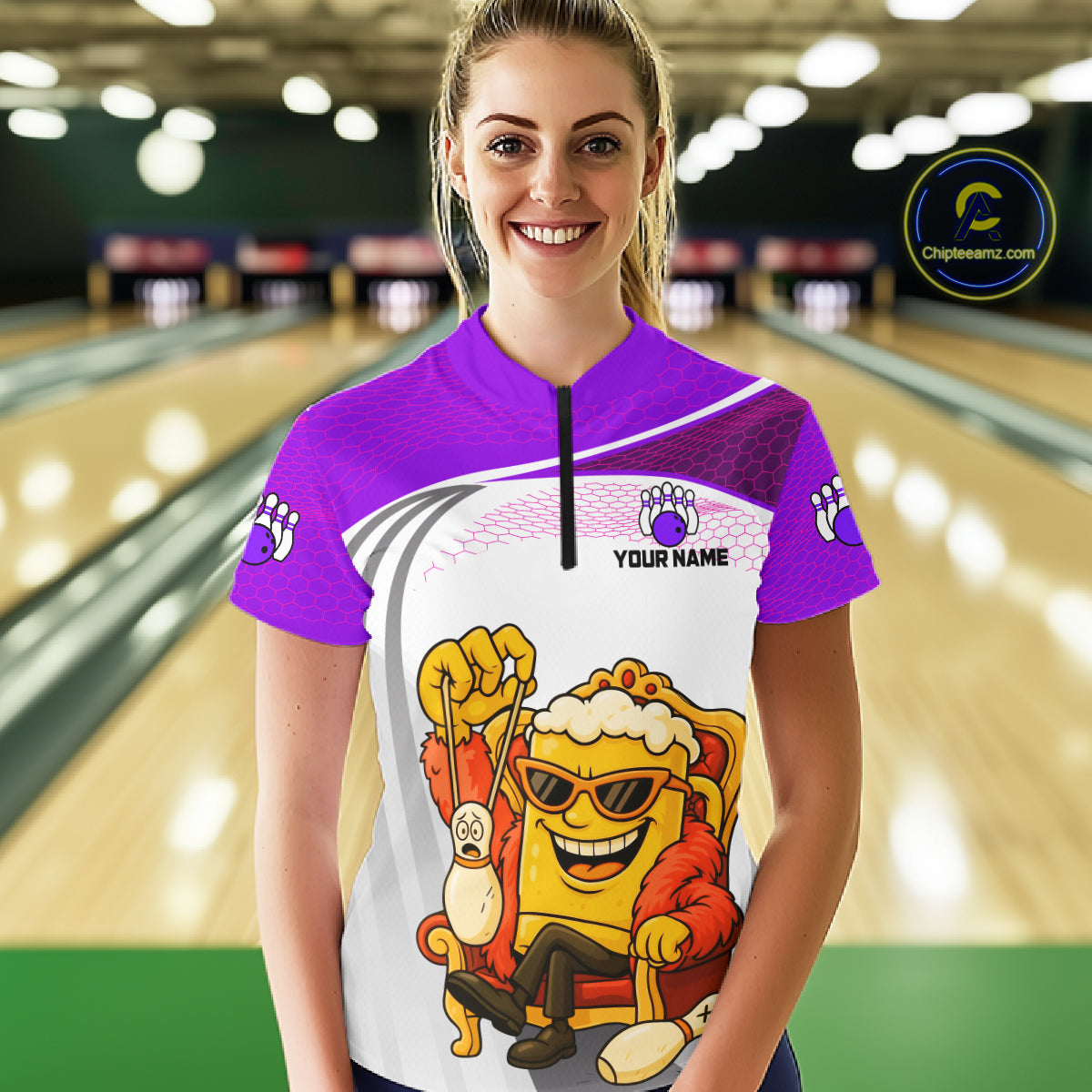 Custom Funny Purple Beer Polo Bowling Team Shirt for Women Quarter-Zip Bowling Jersey Outfit QZT820