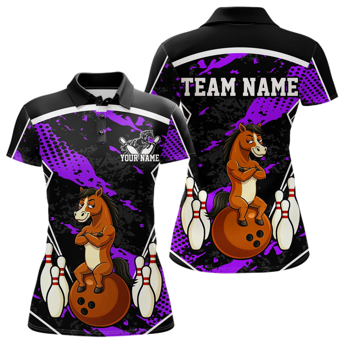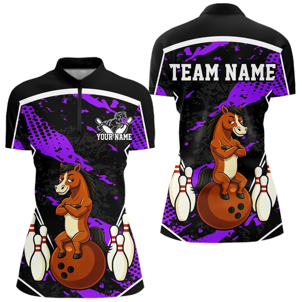 Custom Purple Funny Horse Bowling Tournament Jersey for Women Bowling Team Shirts Polo & 1/4 Zip HNT180