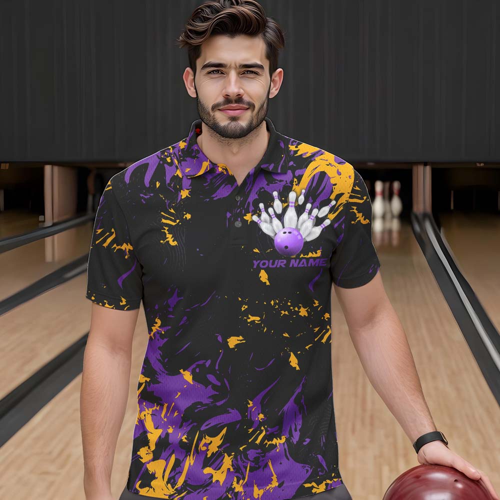 Black, Purple And Yellow Custom Bowling Team Men Polo Shirts, Bowling Ball And Pin Jerseys IPHW8797
