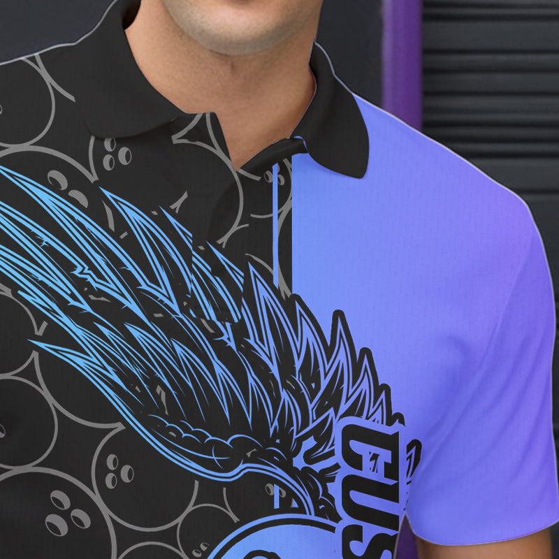 Blue And Purple Custom Bowling Tournament Men Polo Shirts, Bowling Ball And Wings Jerseys IPHW8845