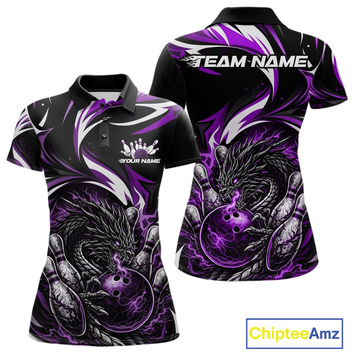 Custom Purple Lightning Dragon Bowling Women Polo Shirts, Dragon Bowling League Shirt IPHW10358