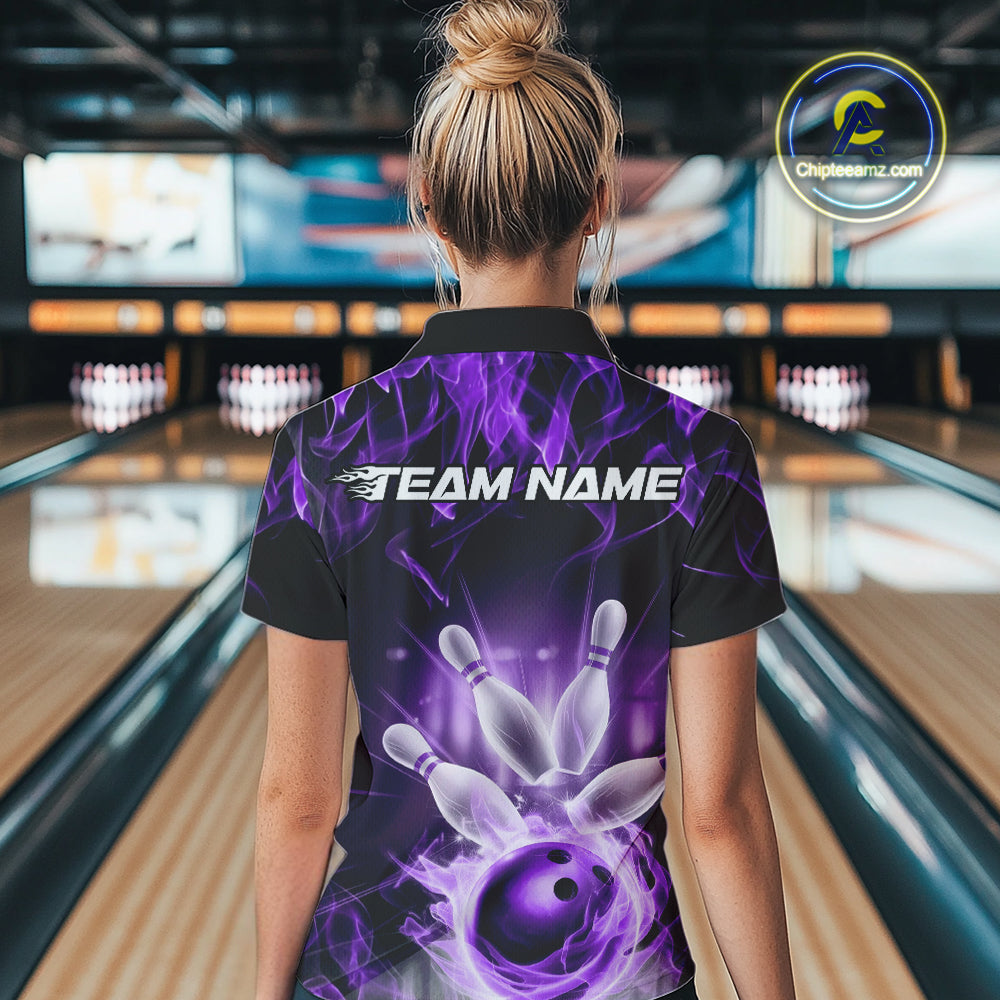 Custom Black And Purple Flame Bowling Team Women Polo Shirts, Fire Bowling League Shirt IPHW9387