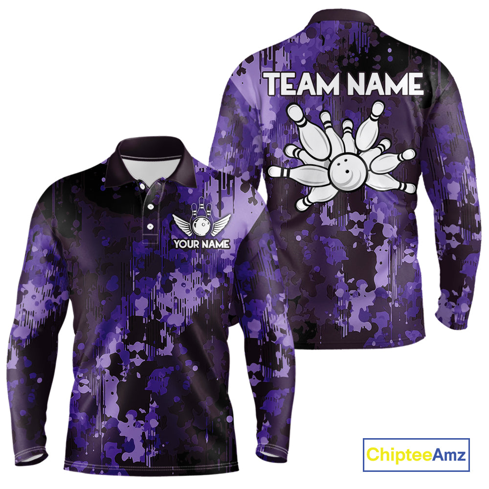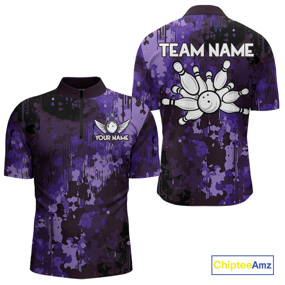 Purple Camo Bowling Polo, Quarter Zip Shirts For Men Custom Bowling Team Jerseys, Gift For Bowlers NQS10455
